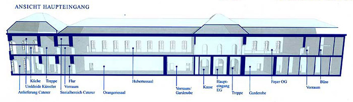 Unter dem markanten Uhrturm des Nordflügels befindet sich das zentrale Eingangsportal zum Orangerietrakt. Durch das großzügige Foyer im Erdgeschoss (ca. 158 qm) gelangen Sie linker Hand in den Orangeriesaal. Im Erdgeschoss befinden sich außerdem Garderobe und WCs (behindertengerecht) sowie die Anlieferzone für Caterer.
